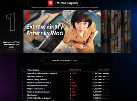24일 글로벌 OTT(온라인동영상서비스) 넷플릭스가 집계하는 주간 '넷플릭스 톱10'에 따르면 ENA 수목드라마 '이상한 변호사 우영우'(극본 문지원, 연출 유인식, 이하 '우영우')는 비영어권 TV 프로그램 부문 1위를 차지했다. 지난 15일부터 21일까지 일주일간 전세계 넷플릭스 이용자들의 시청 시간 합산 결과를 토대로 집계된 순위다.