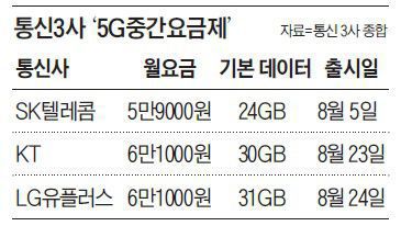 같은 날 KT도 5G 중간요금제를 출시했다. KT의 ‘5G 슬림플러스’는 월 6만1000원에 30GB 데이터를 제공한다. LG유플러스의 중간요금제는 KT를 의식했는지, 동일한 가격에 데이터를 1GB 더 제공하는 방식으로 요금제를 설계했다. KT도 SK텔레콤(24GB)보다 요금은 2000원 더 비싸지만, 데이터를 6GB 더 제공하는 차별화 전략을 펼쳤다.