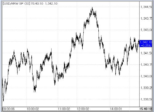[이데일리 이윤화 기자] 원·달러 환율이 7거래일 만에 하락 전환했지만 1330원대 하락 안착엔 실패했다. 역외환율 하락을 따라 1330원대로 내려 출발했지만 달러 매수 수요에 낙폭을 일부 반납하고 3원 가량 하락한 1342원선에 마감했다.