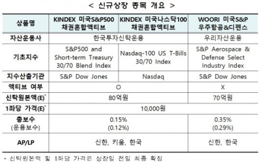 한국거래소(이사장 손병두)는 한국투자신탁운용의 혼합자산형 액티브 ETF 2종목(KINDEX 미국S&P500 채권혼합액티브, KINDEX 미국나스닥100 채권혼합액티브), 우리자산운용의 해외주식형 패시브 ETF 1종목(WOORI 미국S&P 우주항공&디펜스) 등 ETF 3종목을 오는 8월 26일 유가증권시장(코스피)에 상장할 예정이라고 24일 밝혔다.