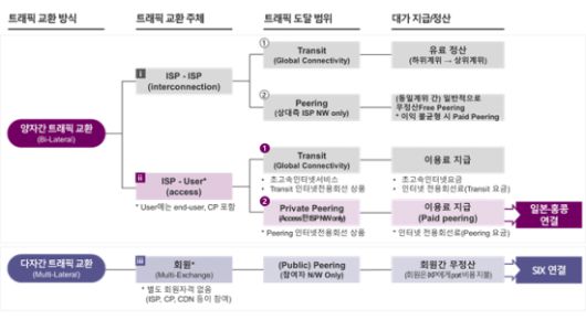 넷플릭스는 2016년 국내 서비스 론칭 과정에서 미국 시애틀의 인터넷교환노드(IX)를 통해 SKB와 처음 연결했다. IX는 통신사(ISP) 간 데이터트래픽을 원활하게 소통시키기 위한 인터넷 연동 서비스다. 시애틀 IX는 레이어2(퍼블릭 피어링) 방식을 이용했다. 퍼블릭 피어링은 통신사가 용량에 따른 포트 비용을 IX에 지불하면, IX가 등록된 다른 통신사 회선으로 데이터 주소를 연결해 주는 방식이다. 동일한 IX를 이용하는 통신사·CP는 서로간에 회선 사용료 등을 지불하지 않는 게 일반적이다. 2018년 일본 브로드밴드IX 연결은 레이어3(프라이빗 피어링) 방식을 이용했다. 통신사와 CP가 회선 비용을 계약하고 합의 하에 서로 회선을 연결하는 장소로 IX를 이용하는 방식이다.