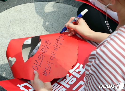 (세종=뉴스1) 김기남 기자 = 25일 오후 세종시 정부세종청사 국토교통부 앞에서 열린 이스타항공 재운항을 위한 운항증명(AOC) 발급 요청집회에 참석한 근로자대표가 '이스타항공은 반드시 다시 비상한다!'란 희망 문구를 적고 있다. 2022.8.25/뉴스1kinam@news1.krCopyright ⓒ 뉴스1. All rights reserved. 무단 전재 및 재배포 금지.