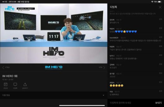 MC가 온라인동영상서비스 티빙에서 14일 임영웅 공연 생중계 전 이용자들과 채팅을 통해 대화하고 있다. 티빙은 오후 5시에 예정된 공연 1시간 30분 전부터 실시간 연결 등을 확인할 수 있는 공연 준비 프로그램을 진행했다. 독자 제공 |