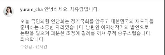 차유람은 지난 25일, 본인의 SNS 계정을 통해 "오늘(25일) 국민의힘 연찬회는 정기국회를 앞두고 대한민국의 재도약을 준비하는 소중한 자리였다"며 "남편인 이지성 작가의 발언으로 논란을 일으켜 과분한 초청에 결례를 끼쳐 무척 송구스럽고 죄송하다"며 사과의 말을 전했다.