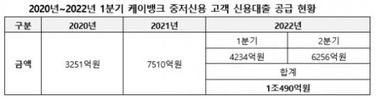2020년~2022년 1분기 케이뱅크 중저신용 고객 신용대출 공급 현황 표. / 자료제공=케이뱅크 |