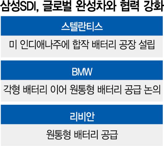 삼성SDI가 글로벌 완성차 업계와의 배터리 협력을 강화하고 있다. 미국 3대 완성차 업체인 스텔란티스와 인디애나주에 합작공장 설립에 나섰고 독일 BMW와는 각형 배터리에 이어 원통형 배터리도 공급하는 방안을 논의하고 있다. 리비안을 비롯한 미국 전기차 스타트업에도 배터리를 납품하며 공급처를 다변화했다.