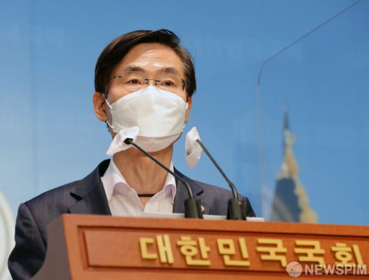 [서울=뉴스핌] 최상수 기자 = 조경태 국민의힘 의원이 28일 서울 여의도 국회 소통관에서 권성동 원내대표의 사퇴와 현 지도부의 대승적 결단을 촉구하는 기자회견을 하고 있다. (공동취재사진) 2022.08.28 photo@newspim.com