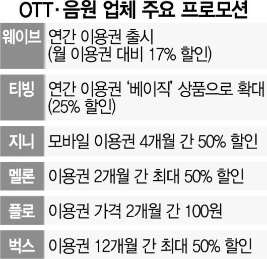 음원 스트리밍 업계도 요금 할인 경쟁이 치열하다. 지니는 최근 모바일 이용권 요금을 12개월 간 매월 25% 할인해주는 프로모션에 이어, 할인폭을 키워 4개월 간 매월 50% 할인해주는 프로모션을 새로 시작했다. 멜론, 플로, 벅스 등도 할인 프로모션을 계속 진행 중이다.