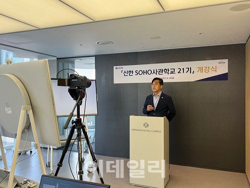 서울시 명동 소재 신한 익스페이스에서 류은상 신한은행 기업고객부 셀장이 신한 SOHO사관학교 21기 개강식을 비대면 화상회의로 진행하는 모습. (사진=신한은행) |