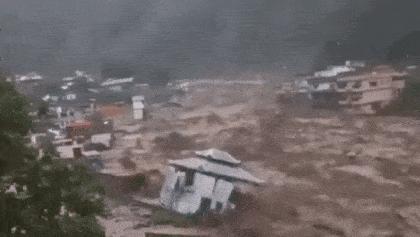 파키스탄 북부 칼람시에서 신축한 '허니문 호텔'이 한순간에 붕괴되는 모습. 트위터 캡처 |