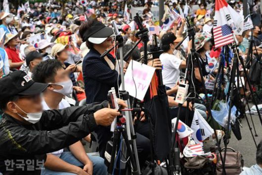 광복절인 15일 서울 종로구 동화면세점 앞에서 열린 보수단체 집회에 1인 유튜버들이 즐비해있다. 고영권 기자 |