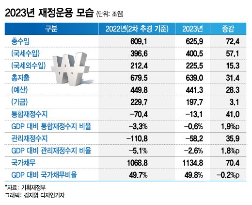 윤석열 정부는 재정건전성 악화를 더 두고볼 수 없다고 판단했다. 한덕수 총리는 이날 국무회의에서 "지나친 확장적 재정 운용으로 국가채무가 지난 5년 사이 400조원 이상 증가해 올해 말 약 1070조원에 이를 전망"이라며 "우리 미래 세대에게 빚더미인 나라를 물려줄 순 없다"고 했다. 추경호 부총리 겸 기획재정부 장관도 지난 25일 2023년 예산안 사전브리핑에서 "건전재정으로의 전환은 누적되는 국가채무 위험, 국가경제의 장래를 생각할 때 더 이상 미룰 수 없는 힘들어도 가야만 하는 과제"라고 말했다.