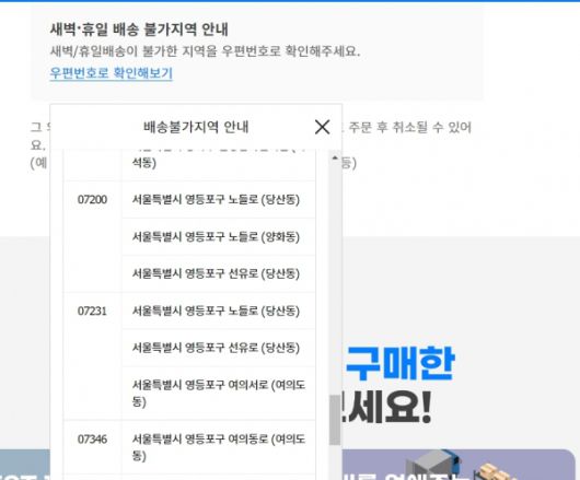 지마켓이 내걸고 있는 스마일배송이 아직 체계적이지 못하다는 점인데요. 지마켓은 '스마일 배송'을 통해 전국 익일배송 서비스를 시작하고, 신세계그룹에 인수된 이후 지난 3월 서울 지역을 대상으로 새벽배송(상온 보관 상품만 가능) 및 휴일 배송을 선보이고 있습니다. 서울 전체 지역에 해당한다고 홍보하고 있지만, 서울 한복판인데도 새벽·휴일 배송이 불가능한 지역이 아직 많은데요. 일례로 서울 영등포구 여의도동과 흑석동 한강 현대 등은 서울 중심지임에도 불구하고 배송 불가 지역으로 나옵니다.