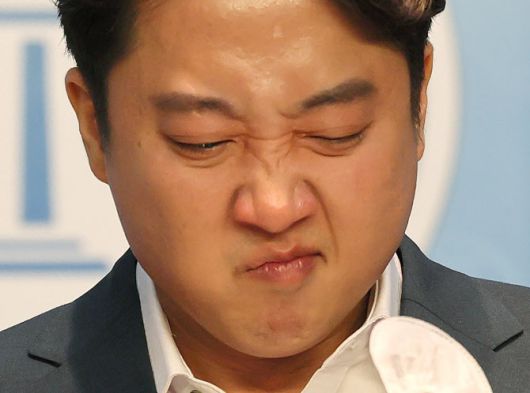 이준석 국민의힘 대표가 13일 오후 국회 소통관에서 기자회견을 열고 당 비상대책위원회 체제 전환에 대한 가처분 신청 등과 관련해 직접 입장을 밝히던 중 눈물을 닦은 뒤 얼굴을 찡그리고 있다. (사진=연합뉴스) |