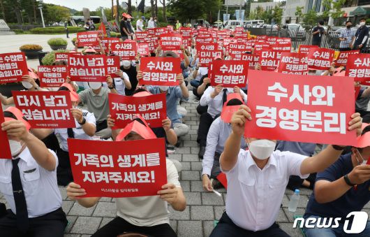 (서울=뉴스1) 송원영 기자 = 이스타항공 근로자들이 31일 오후 서울 용산구 전쟁기념관 앞에서 수사와 별개로 정상적인 영업 활동을 할 수 있도록 항공운항증명(AOC) 발급 절차 진행 촉구 집회를 하고 있다. 이날 집회에서 이스타항공 직원들은 "국토부의 AOC중단으로 수 많은 직원들의 생계가 위협을 받고 있다"며 "정부가 수사와 AOC발급 절차 진행을 별개로 해서 직원들이 일자리 만큼은 지켜야 한다"고 촉구했다. 2022.8.31/뉴스1