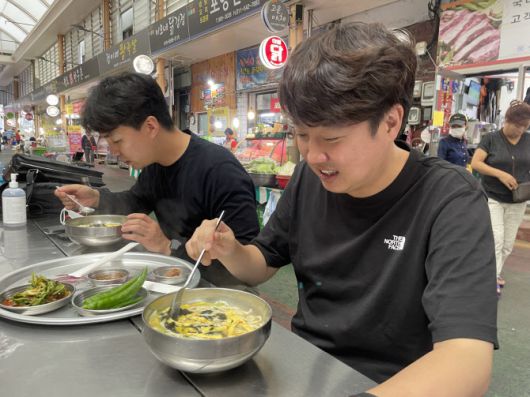 이준석 전 국민의힘 대표가 30일 오후 대구 동구 방촌시장을 찾아 칼국수를 먹고 있다.(사진=연합뉴스 제공) |
