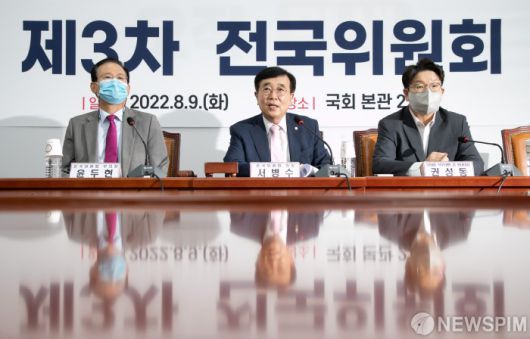 [서울=뉴스핌] 김민지 기자 = 서병수 국민의힘 전국위원회 의장이 지난 9일 오전 서울 여의도 국회에서 열린 국민의힘 제3차 전국위원회에서 인사말을 하고 있다. 왼쪽부터 윤두현 전국위 부의장, 서 의장, 권성동 당대표 직무대행 겸 원내대표. (공동취재사진) 2022.08.09 photo@newspim.com |