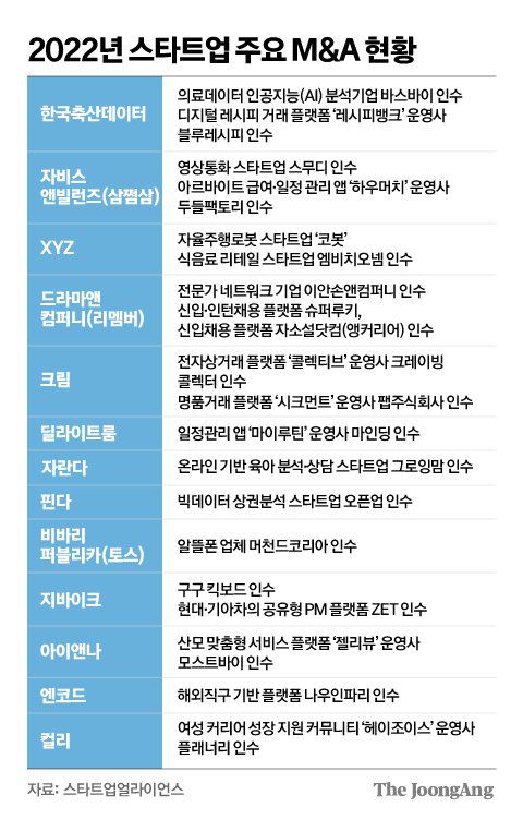 투자금 혹한기를 맞은 스타트업들이 합종연횡에 나서고 있다. 글로벌 금리 인상 기조에 따라 벤처투자(VC)업계가 돈줄을 조이자, 곳간에 여유가 있는 스타트업들이 체급이 더 낮은 스타트업을 인수·합병(M&A)하는 사례가 느는 것이다.