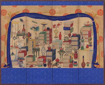 문방도 속 책과 기물은 학문과 배움을 추구하고, 골동품을 수집하고 감상하는 왕실의 취미를 보여준다.