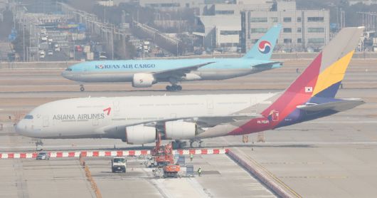 인천국제공항 주기장에 세워진 대한항공과 아시아나항공의 항공기. [연합] |