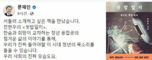 문재인 전 대통령이 “서둘러 소개하고 싶은 책을 만났다”면서 ‘청년 용접공’ 천현우 씨의 산문집 ‘쇳밥일지’를 추천했다.