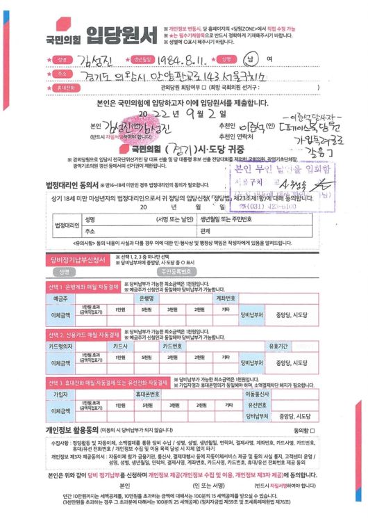 김 대표는 지난 2일 자신의 변호인 강신업 변호사를 통해 전달한 입장문을 통해 “이 자꾸 당원가입하라고 호객행위를 하는 바람에 국민의힘 당원가입 신청을 했다”며 수감중인 서울구치소에서 작성한 입당원서를 공개했다. 강 변호사는 이 당원서를 3일 자신의 페이스북을 통해 공개하며 “준석이가 그렇게 입당을 원한다니”라고 적었다.