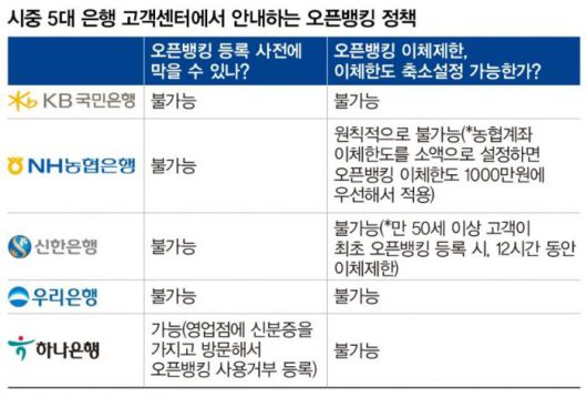 우리은행만의 입장인지 확인이 필요했다. 사실관계를 보다 명확히 하기 위해 우리은행을 포함한 5대 은행(국민·신한·농협·하나·우리) 고객센터에 동일한 질문을 했다. 답변의 포장을 막기 위해 은행 홍보팀이 아닌 일반 고객들이 접근할 수 있는 ‘고객센터’에 연락했다. 그 결과 자체 시스템으로 사전에 오픈뱅킹 등록제한이 가능하다고 안내하는 곳이 있었다. ‘하나은행’이었다. 하나은행 관계자는 “오픈뱅킹 이용을 원하지 않으면 가까운 영업점에 신분증을 가지고 방문해 오픈뱅킹 사용거부 등록을 하면 된다”고 말했다. 등록제한이 기술적으로 불가능한 것은 아니라는 의미다. 이외 4개 은행은 오픈뱅킹 등록을 사전에 제한하는 방법은 없다고 답했다.