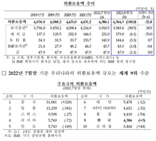 한국은행(총재 이창용)은 5일 2022년 8월말 한국의 외환보유액은 4364억3000만 달러로 전월말 대비 21억8000만 달러 감소했다고 발표했다.