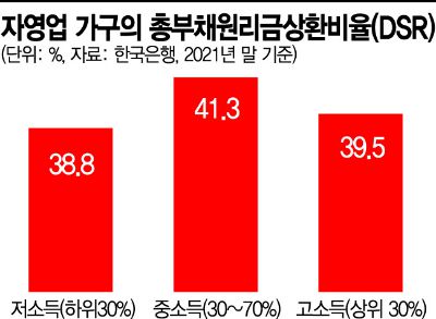 5일 한국은행에 따르면 지난해 중간소득 자영업 가구(상위 30~70%)의 DSR(총부채원리금상환비율)은 41.3%로 집계됐다. 예를 들어 월 100만원을 벌면 41만원을 빚 갚는데 쓴다는 뜻이다. 저소득 자영업자는 38.8%, 고소득은 39.5%로 중소득보다 다소 낮았다.