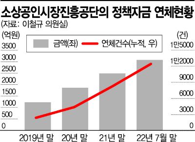 코로나19가 확산하기 직전인 2019년 12월, 정책자금 상환을 90일 이상 연체한 누적 건수는 2410건(1228억원 규모)이었다. 2020년 말에는 4400건(1862억원)으로, 2021년 말에는 8284건(2491억원), 올해 7월에는 1만2424건(3080억원)까지 치솟았다. 불과 3년도 지나지 않아 연체 건수는 5배, 연체 금액은 3배 정도로 늘어난 것이다.