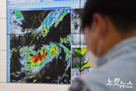 2일 오전 서울 동작구 기상청에서 통보관이 태풍 '힌남노' 상황을 실시간으로 살피고 있다. 류영주 기자