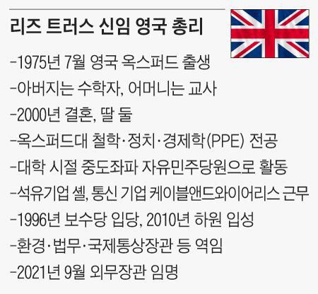 영국의 새 총리로 리즈 트러스(47) 외무부 장관이 선출됐다고 BBC 등 영국 언론들이 5일(현지 시각) 일제히 보도했다. 트러스 장관은 마거릿 대처, 테리사 메이에 이어 영국 역사상 세 번째 여성 총리가 됐다.