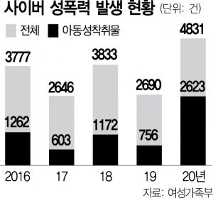 특히 아동 성착취물 사건은 △2016년 1262건 △2018년 1172건으로 1000건 이상을 기록한 바 있으나 2020년은 2623건으로 크게 뛰어 통계 작성 이래 가장 많았다. 불법 촬영물 사건 또한 2020년 842건으로 전년 대비 677건 증가했다.