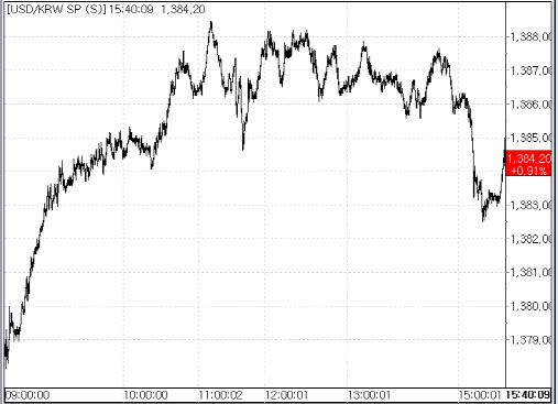 7일 서울외국환중개에 따르면 환율은 전 거래일 종가(1371.7원) 대비 12.5원 뛴 1384.2원으로 5거래일 연속 상승 마감했다. 고가 기준으로는 1388.4원까지 치솟았다. 장중 고가, 종가 기준으로 모두 5거래일 연속 연고점을 경신하면서 급등한 모습이다. 고가 기준으로는 2009년 4월 1일(1392.0원), 종가 기준으로는 2009년 3월 31일(1383.5원) 이후 최고 수준이다.
