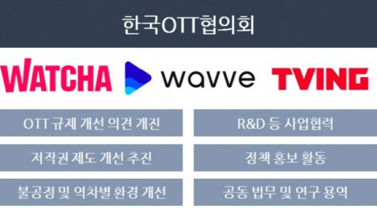 한국 OTT협의회는 2021년 3월 출범했으며 왓챠, 웨이브, 티빙, 카카오, 쿠팡 등이 소속돼 있다.