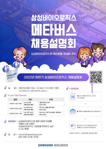 삼성바이오로직스 채용 담당자는 “이번 채용설명회는 지원자들이 가장 필요로 하는 취업 및 직무정보를 강화해 실질적인 도움이 될 수 있도록 준비했다”며 “삼성바이오로직스와 함께 K-바이오 산업을 함께 이끌어갈 인재들의 많은 관심을 기대한다”고 말했다.
