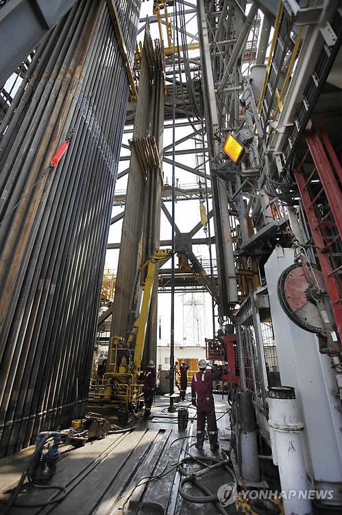 인부들이 멕시코만에 위치한 석유 시추대에서 굴착 파이프를 제거하고 있다. /AP 연합 |