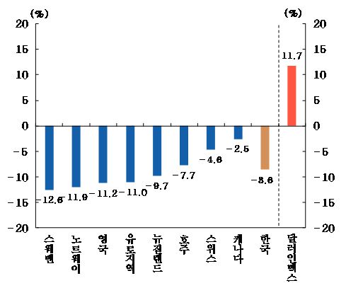 달러화 대비 주요국 통화절하폭. 한국은행 제공. |
