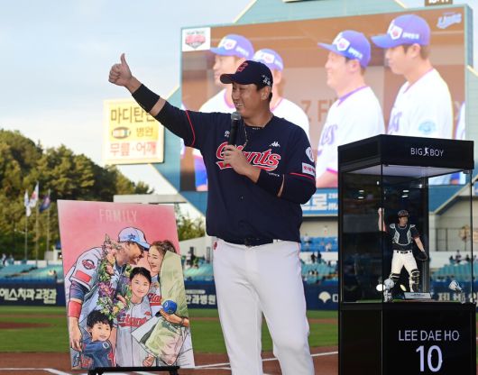 이어 삼성 구단은 지난해 5월 8일 삼성과 경기에서 포수 마스크를 썼던 '포수 이대호' 대형 피규어를 제작해 선물했다. 당시 이대호는 롯데에 포수 엔트리가 없자 마스크를 썼다. 마무리 김원중과 함께 포수로 호흡을 맞춰 1점 차 승리를 지켰다. 이대호는 답례품으로 사인 배트를 삼성 원기찬 사장에게 선물했다.
