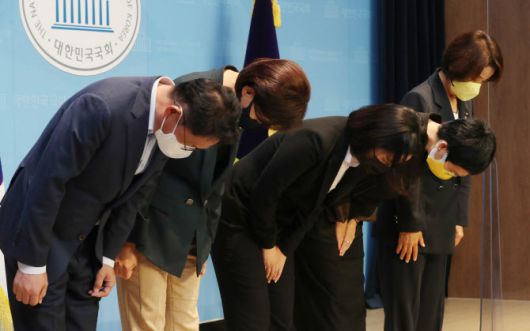 정의당 이은주 비상대책위원장과 의원들이 5일 오전 국회 소통관에서 당원 총투표 관련 의원단 합동 기자회견에 앞서 인사하고 있다. 왼쪽부터 배진교, 강은미, 류호정, 장혜영 의원, 이은주 비상대책위원장. (사진= 공동취재) |