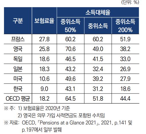 입법조사처는 이를 바탕으로 "우리나라의 소득대체율은 언뜻 보면 수치가 낮아 보여도 실제 낮은 수준이 아니다"라면서 "OECD 회원국 전체 평균(보험료율 18.2%, 중위소득 소득대체율 51.8%)과 비교해 보더라도 제도의 틀만 놓고 봤을 때 우리나라 소득대체율은 보험료율과 비교해 오히려 높은 편"이라고 설명했다. 낸 보험료에 비해 더 많은 돈을 받을 수 있다는 것이다.