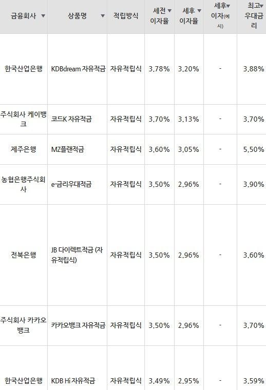 농협은행 ‘e-금리우대적금’과 전북은행 ‘JB 다이렉트적금(자유적립식)’, 카카오뱅크 ‘카카오뱅크 자유적금’은 각각 연 3.50%의 이자를 준다.