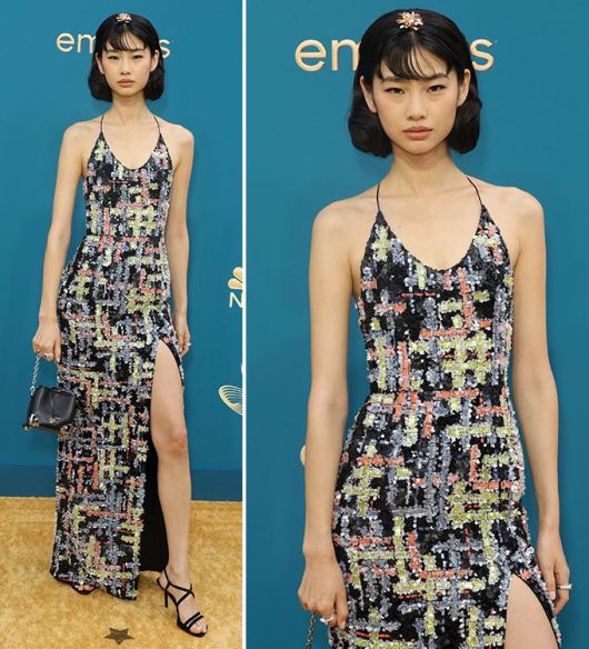 이날 정호연은 알록달록한 시퀸이 화려하게 장식된 홀터넥 드레스를 입고 등장했다.