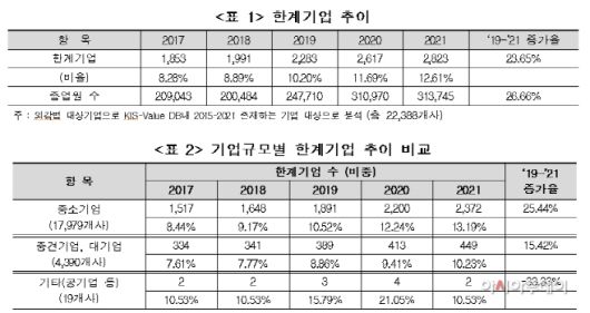 보고서는 2017~2021년 기간 외감법(주식회사 등의 외부감사에 의한 법률)을 적용받는 비금융기업 2만2388개사를 분석한 결과, 2021년 한계기업 수는 총 2823개사로 코로나 이전인 2019년 2283개사 대비 23.7%(+540개) 늘어났으며, 한계기업에 종사하는 종업원 수는 2019년 24만7000개에서 2021년 31만4000명으로 26.7%(+6.7만 명) 증가한 것으로 나타났다.