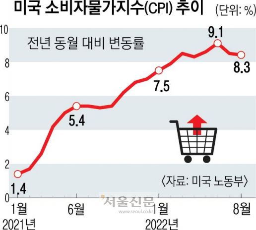 미국 노동부는 13일(현지시간) 8월 CPI가 유가 하락에도 불구하고 전년 같은 달보다 8.3% 올랐다고 밝혔다. 6월에 9.1%로 고점을 찍었던 CPI 상승률이 7월(8.5%)에 이어 2개월 연속 둔화됐지만 미미한 감소세에 그치며 월스트리트저널(WSJ)과 다우존스가 각각 집계한 전문가 예상치(8.0%)를 상회했다. 유가가 떨어졌지만 임대료와 식료품비 상승으로 인해 8월 물가 상승률이 예상만큼 완만하지 않았다는 것을 보여 준다고 뉴욕타임스(NYT)가 이날 평가했다.