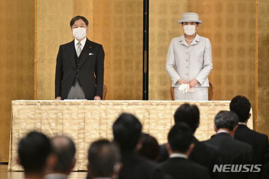[도쿄=AP/뉴시스] 나루히토(왼쪽) 일왕과 마사코 왕비가 지난 12일 도쿄의 한 호텔에서 열린 일본 전몰장병 가족 연합 창립 75주년 기념식에 참석하고 있다. 2022.09.14. |
