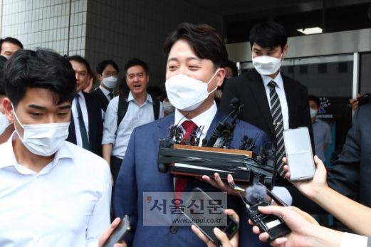 이준석 국민의힘 전 대표가 14일 서울 양천구 서울남부지방법원에서 열린 국민의힘 당헌 효력 정지 가처분 심문을 마친 뒤 법원을 나오고 있다. 2022. 9. 14 김명국 기자 |