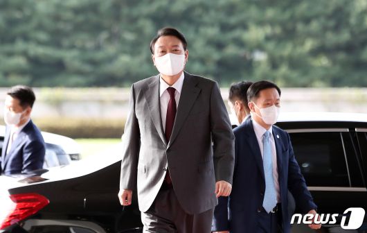 윤석열 대통령이 15일 오전 용산 대통령실 청사로 출근하고 있다. 2022.9.15/뉴스1 ⓒ News1 오대일 기자 |