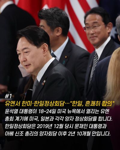 ● 유엔 계기 한미·한일정상회담 개최…"한일, 흔쾌히 합의" 윤석열 대통령이 18∼24일 미국 뉴욕에서 열리는 유엔총회 계기에 미국, 일본과 각각 양자 정상회담을 합니다. 한일정상회담은 2019년 12월 중국 청두에서 열린 당시 문재인 대통령과 아베 신조 총리의 양자회담 이후 2년 10개월 만입니다.