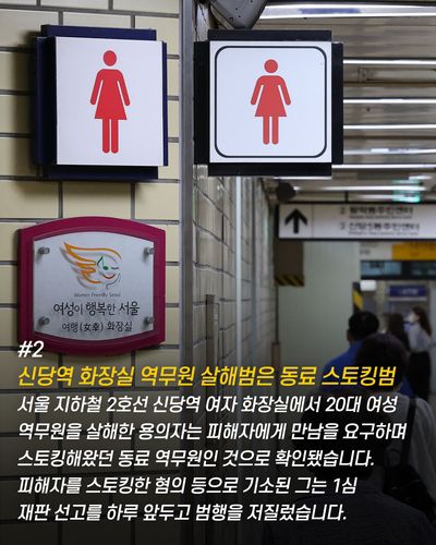 ● 동료 스토킹 역무원, 1심 선고 전날 역사 화장실서 피해자 살해 서울 지하철 2호선 신당역 여자 화장실에서 20대 여성 역무원을 살해한 용의자는 피해자에게 만남을 요구하며 스토킹해왔던 동료 역무원인 것으로 확인됐습니다. 피해자를 스토킹한 혐의 등으로 기소된 그는 1심 재판 선고를 하루 앞두고 범행을 저질렀습니다.